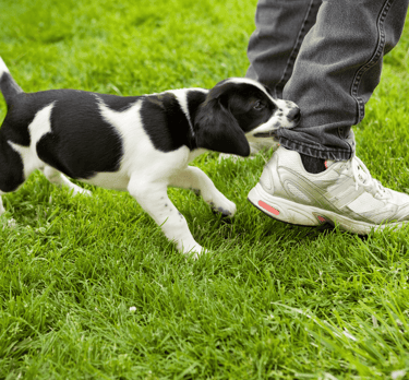 Some puppies instinctively grab moving clothing because it mimics herding behavior.
